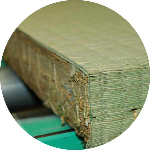 30Kg以上の稲わらを平らに約40cmまで積み重ね、5cmの厚さまで圧縮して作るため畳ならではの耐久性、弾力性、吸放湿性、断熱・保温性、難燃性という点が一番優れています。たくさんのわらを使用し、配列を多くし、縫い目間隔が細かいものが高級品とされています。感触が良く、表替えを繰り返しても丈夫で、天然素材であるため室内の湿度を調節する調湿機能は他の床材に比べ、最も優れています。また、吸音効果、防音効果を備えています。高、中級クラスの畳表との組み合わせにより、その質感は一段と発揮されます。